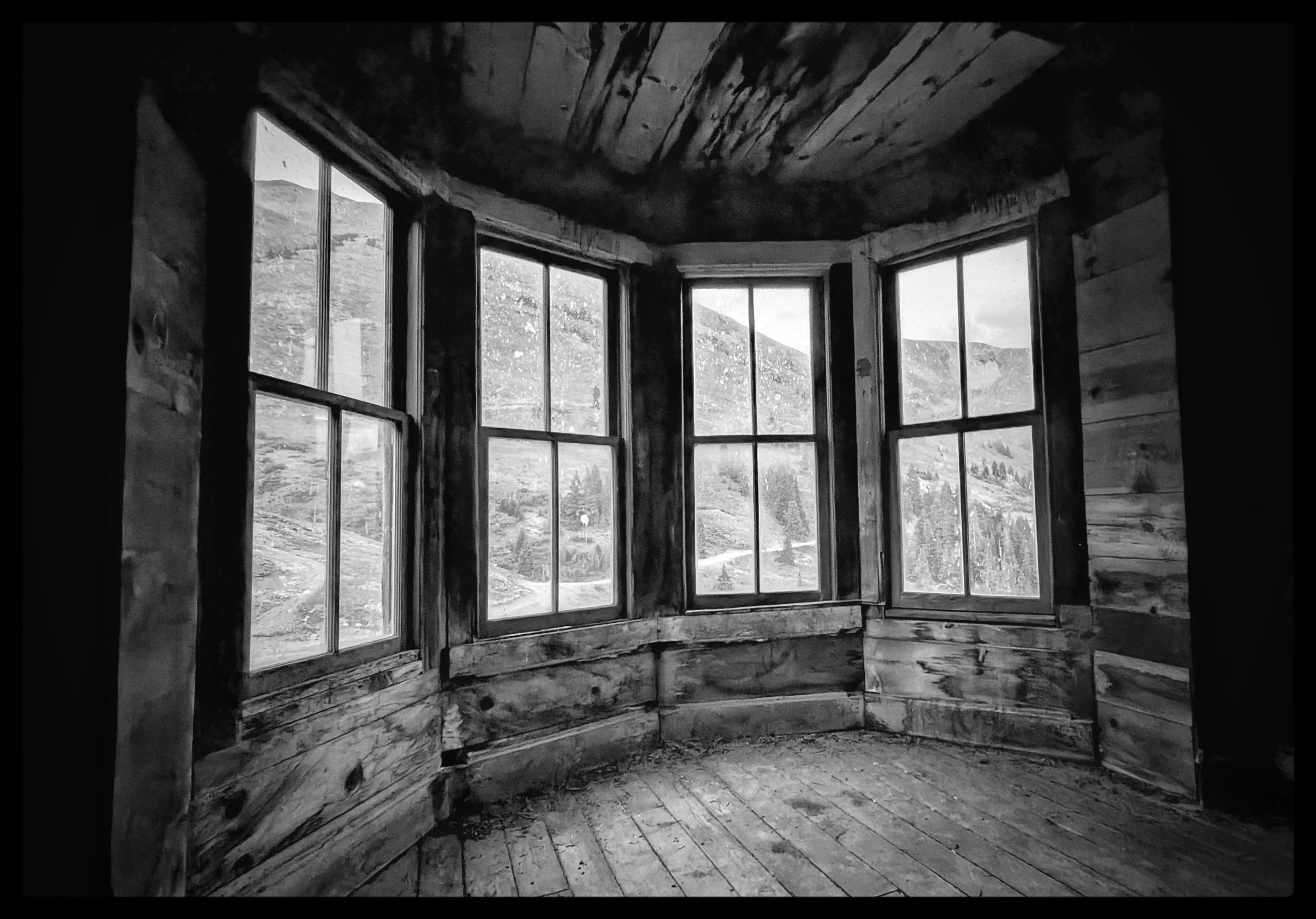 Looking out the famous front Bay windows of the William Duncan household in Animas Forks.