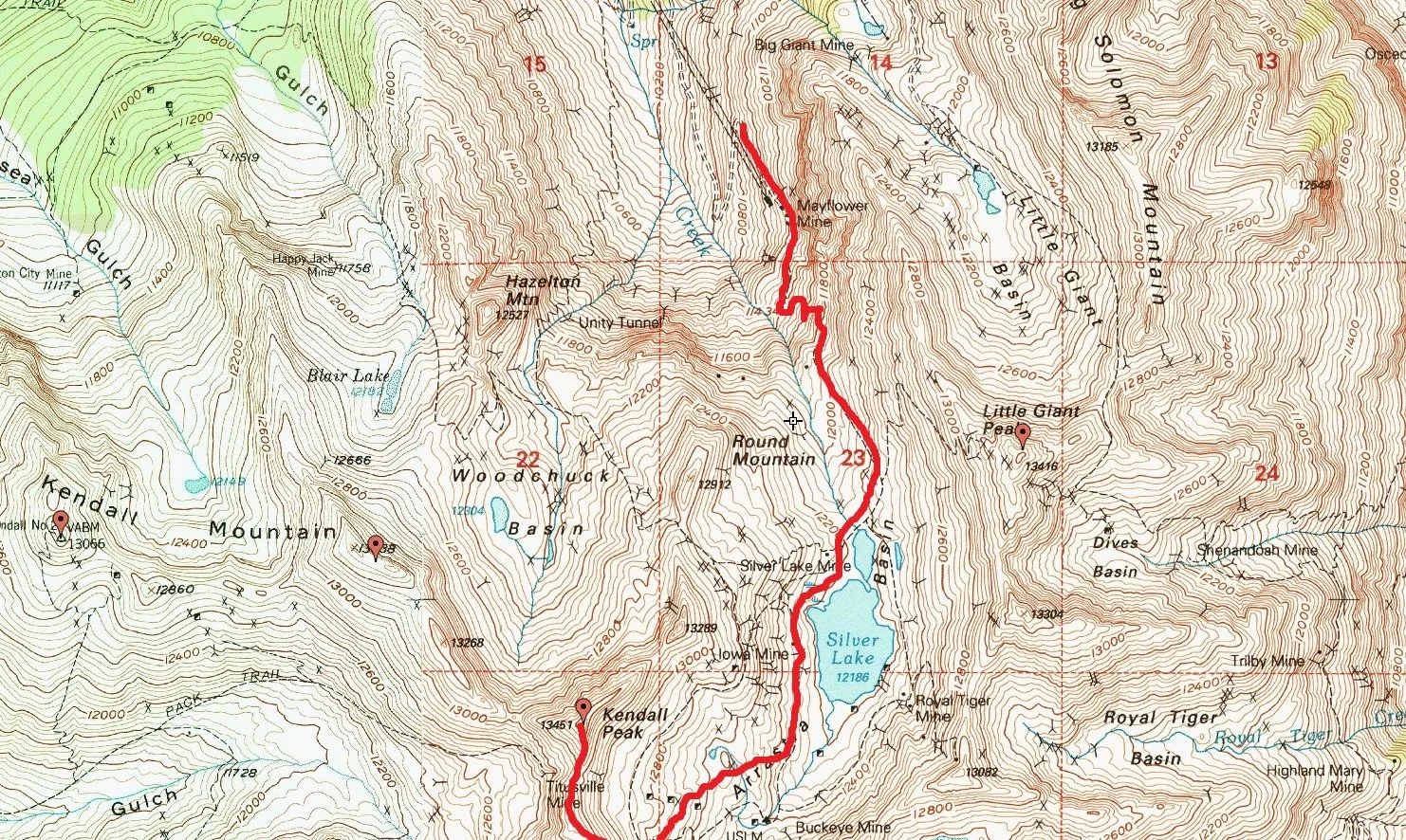 Kendall Peak is a mid-13er with 1,148’ of prominence in the Howardsville Quad. It is not the easiest destination to get to nor is it the hardest. If one doesn’t have a 4x4 vehicle to drive up Kendall Mountain Road out of Silverton (San Juan County #33), there’s going to be some extra mileage involved. Most folks start at the Titusville Mine on the west side. From the end of the road, the summit of Kendall Peak is only a paltry 651’ away. But again, that’s only if someone has a 4x4 vehicle. I imagine someone could feasibly drive a Subaru or comparative vehicle up the road, but it’s going to be an exceptionally rough drive. It’s even slow for trucks and Jeeps. However, if one doesn’t mind some extra mileage and an easier, 2-wd trailhead, there is a backdoor to Kendall Peak that grants the explorer the opportunity to walk through some history, literally.