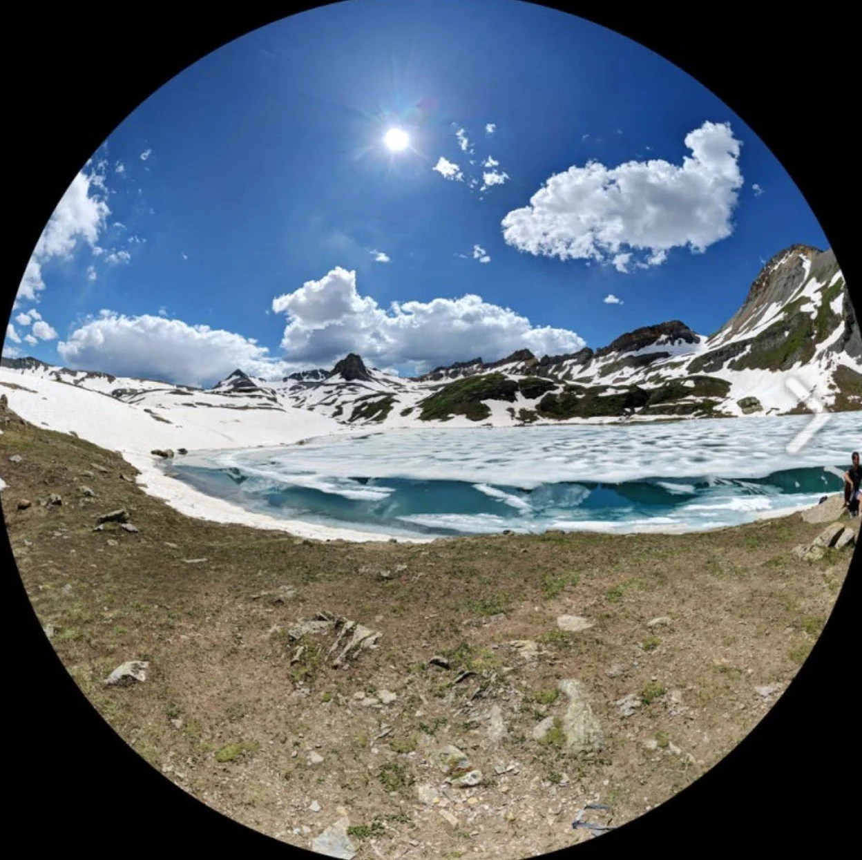“You’ve got to be kidding me!” I said loudly to no one in particular and attracting the looks of some people. Ice Lake was full of ice (go figure). The upper basin was equally holding snow normally indicative of May. I was exasperated. I looked around and found an unclaimed rock away from the day-hikers, sat down and stared at all the snow. I was in Antarctica minus all the cute penguins. I tried to make light of the situation by thinking Father Winter had decided to vacation up here so he could hit Colorado again even harder next winter…it wasn’t working. I was planning on spending 3-4 days here, now what? I had no snow equipment with me.