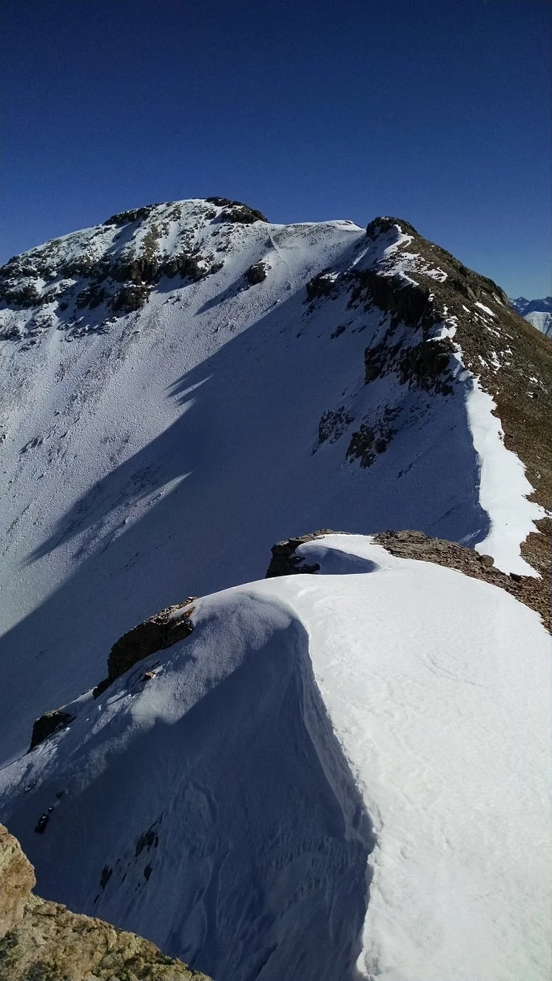 I decided to head up Fuller Peak (13,761’) first, an unranked peak. I wanted to finish on Vermilion for obvious reasons. Plus from Fuller, I could get a good look at the ridge. I descended back to the saddle, retrieved my pack and started up Vermilion to where my snowy conclusion was waiting. 150’, climbed down a small cliff and plopped down onto the ledge.