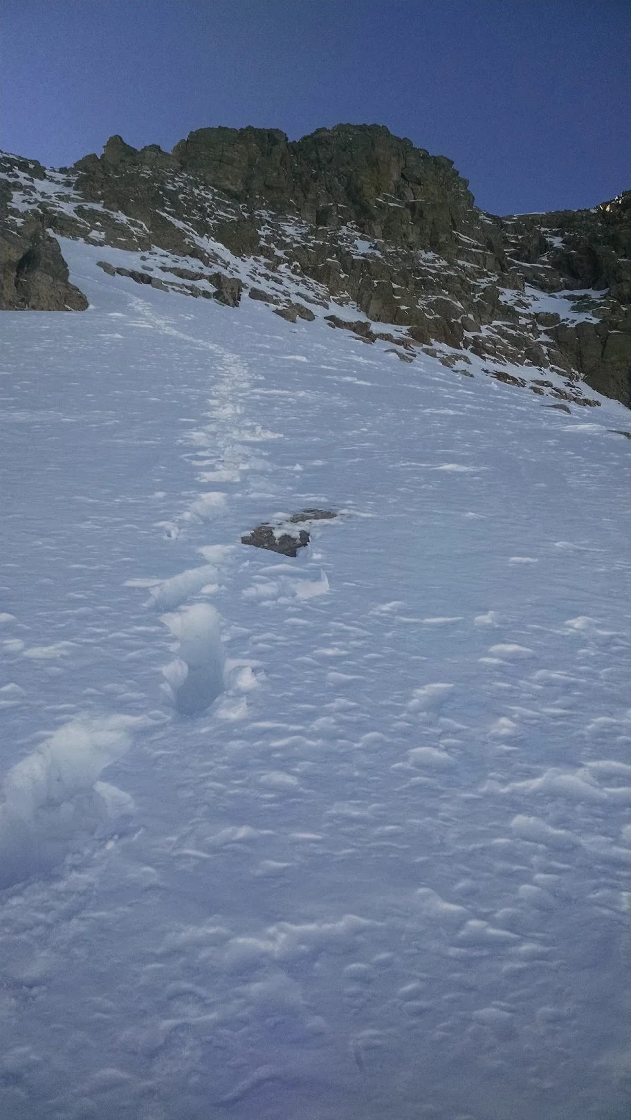 I tried going up it but that was borderline laughable. I studied the cliff climbers, right but with the loose rock, I didn’t want to risk a multi-hundred foot fall. The cliff climbers left was worse. I took a couple steps back and surveyed the mountain. I spied a good ledge down below that cut across the entire East Face to the standard route. It was insulated in snow but even wearing shorts, I surmised that it would be dry and shallow. I descended about 150’, climbed down a small cliff and plopped down onto the ledge.