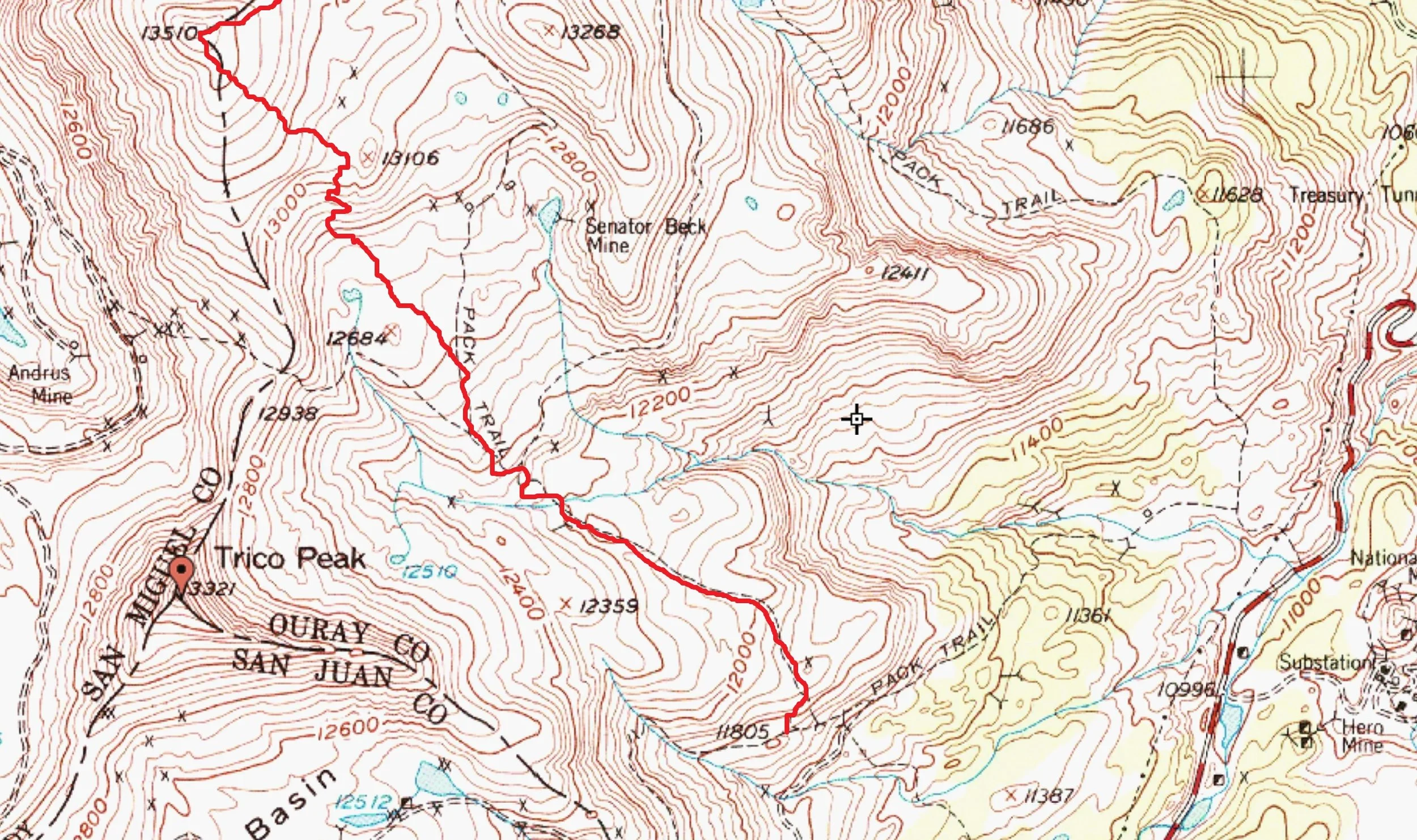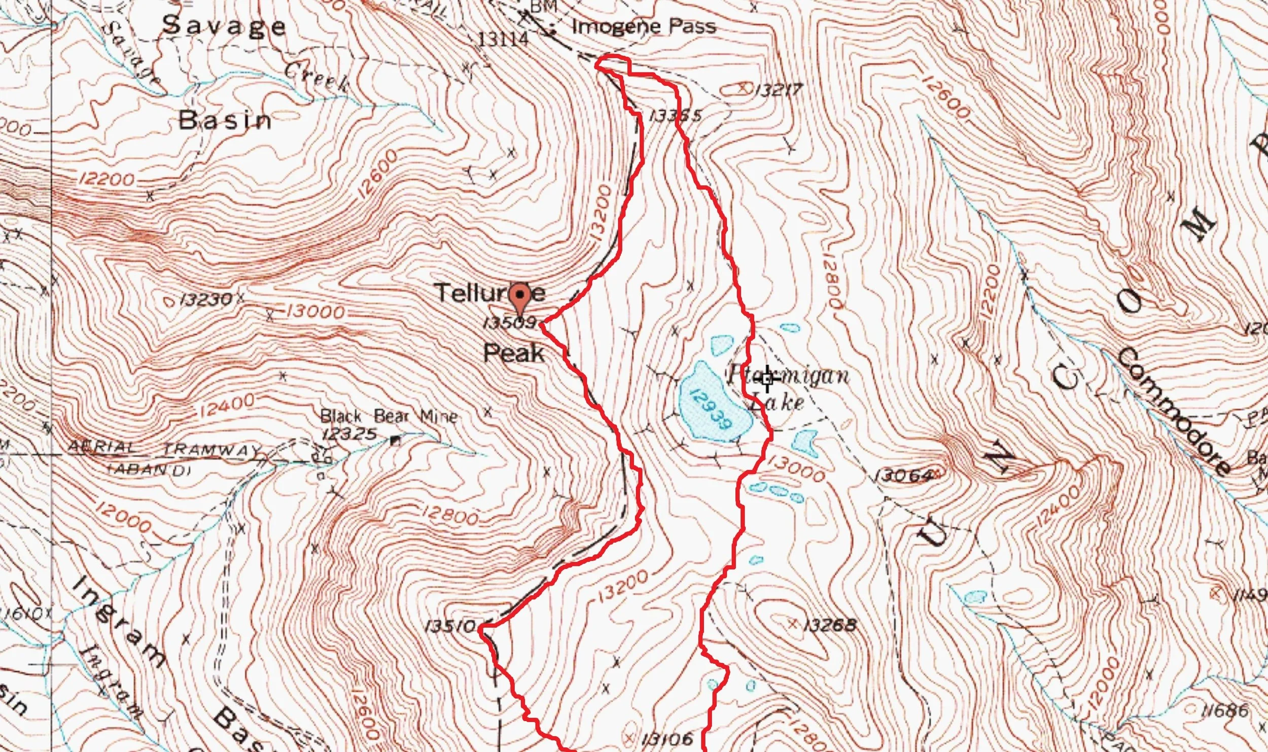 Machinery and splintered power lines littered the grounds around the lake and for a decent chunk of our traverse back to Black Bear. We left Ptarmigan Lake (12,980’) and followed a scant trail south crossing a few basins, meadows and even dodged some cliffs. Having already done the three peaks that incorporate the Red Mountain Massif and Brown Mountain to the east, I’ve always wondered what this side of 550 looked like.