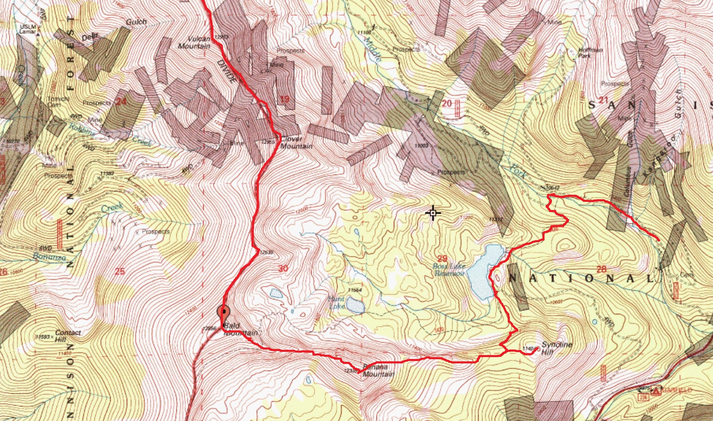The plan was to have Regina drop me off at the Boss Lake Trailhead. Then I’d amble up to my first objective, Syncline Hill and southwest towards Bald Mountain. Then I’d cruise the ridge north towards Hancock Peak, down to Hancock Pass and out via the rough 4x4 road to the old town site of Hancock where Regina would be waiting. And for the most part, that’s exactly how things turned out.